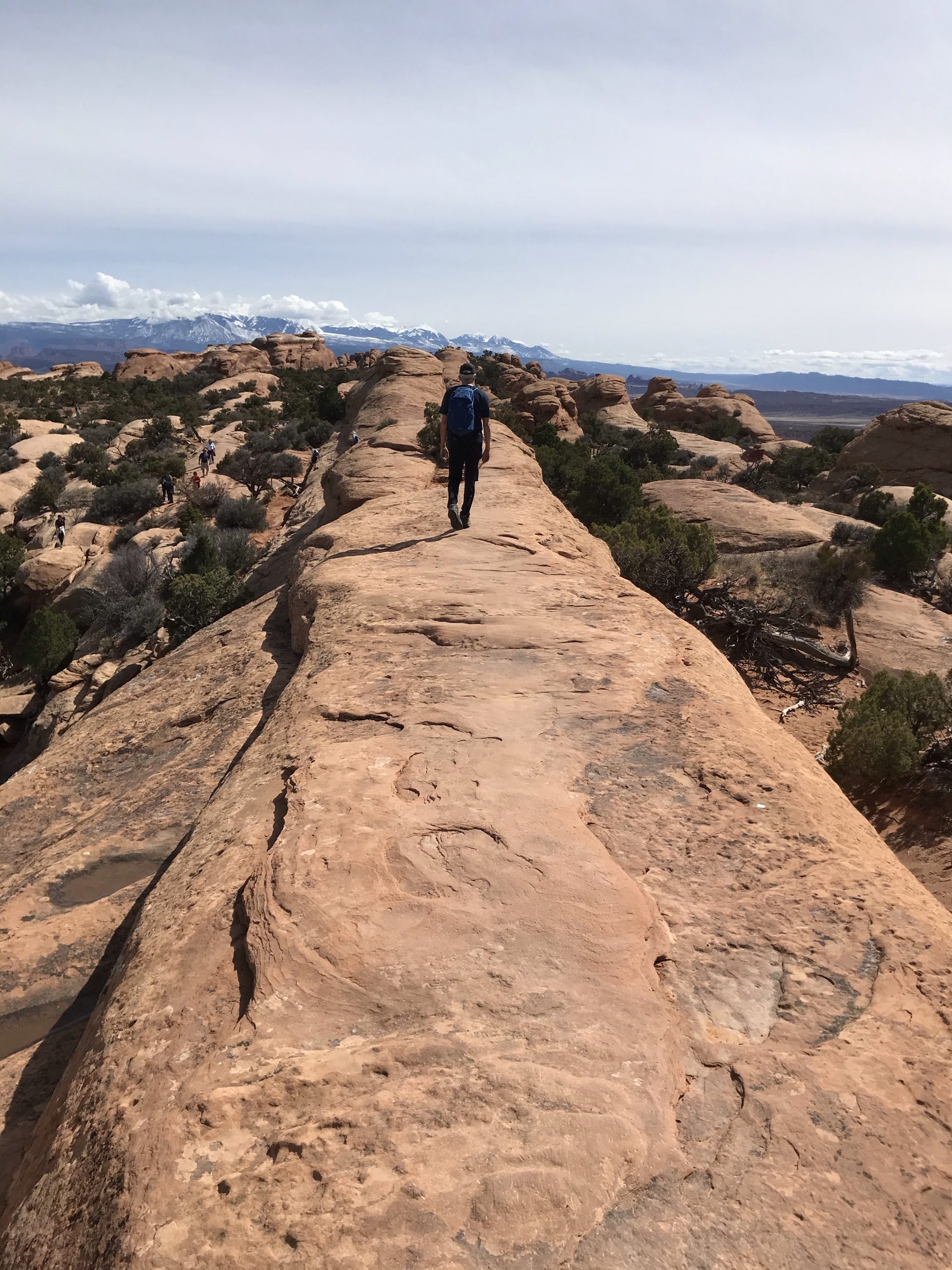 The hike to Delicate Arch took us up along open sandstone slabs, easy on legs used to the steep trails of eastern mountains (but probably hot as hell on a summer day). In the distance, thunder rumbled, and we kept a close eye on a dark cloud to see where it was heading.