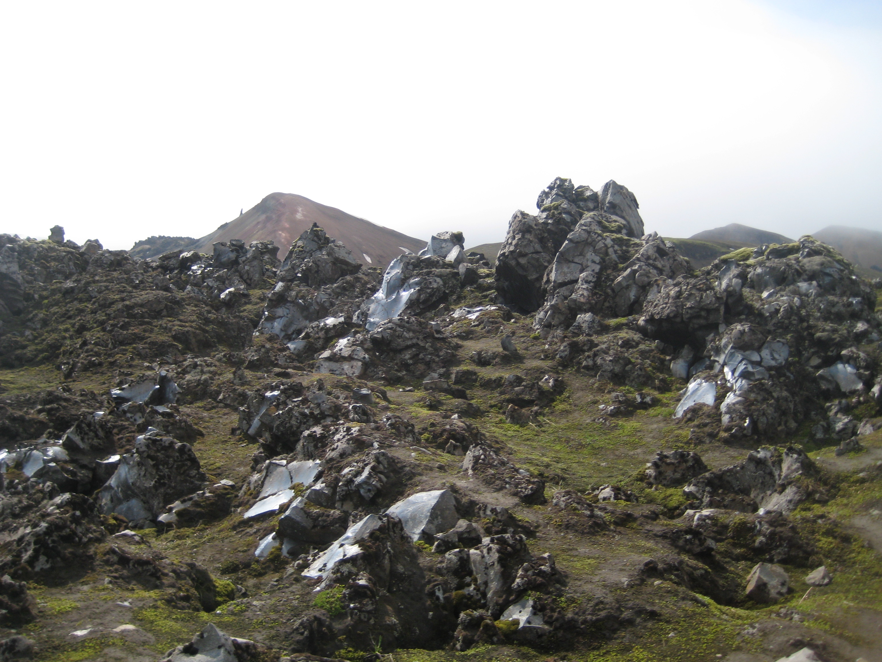 As we begin our hike from Landmannalaugar, I feel like I am 25 again, discovering new worlds for the very first time: vast green alpine fields, steaming fumaroles, a wide open landscape that stretches for miles. A dark cloud chases us for a while, but after a morning of steady rain on the bus ride from Reykjavik, the rain has stopped. Every few steps demands a photograph: bubbling mudpots, heaps of shiny obsidian strewn across the ground, barren brown hills painted with grassy swathes.