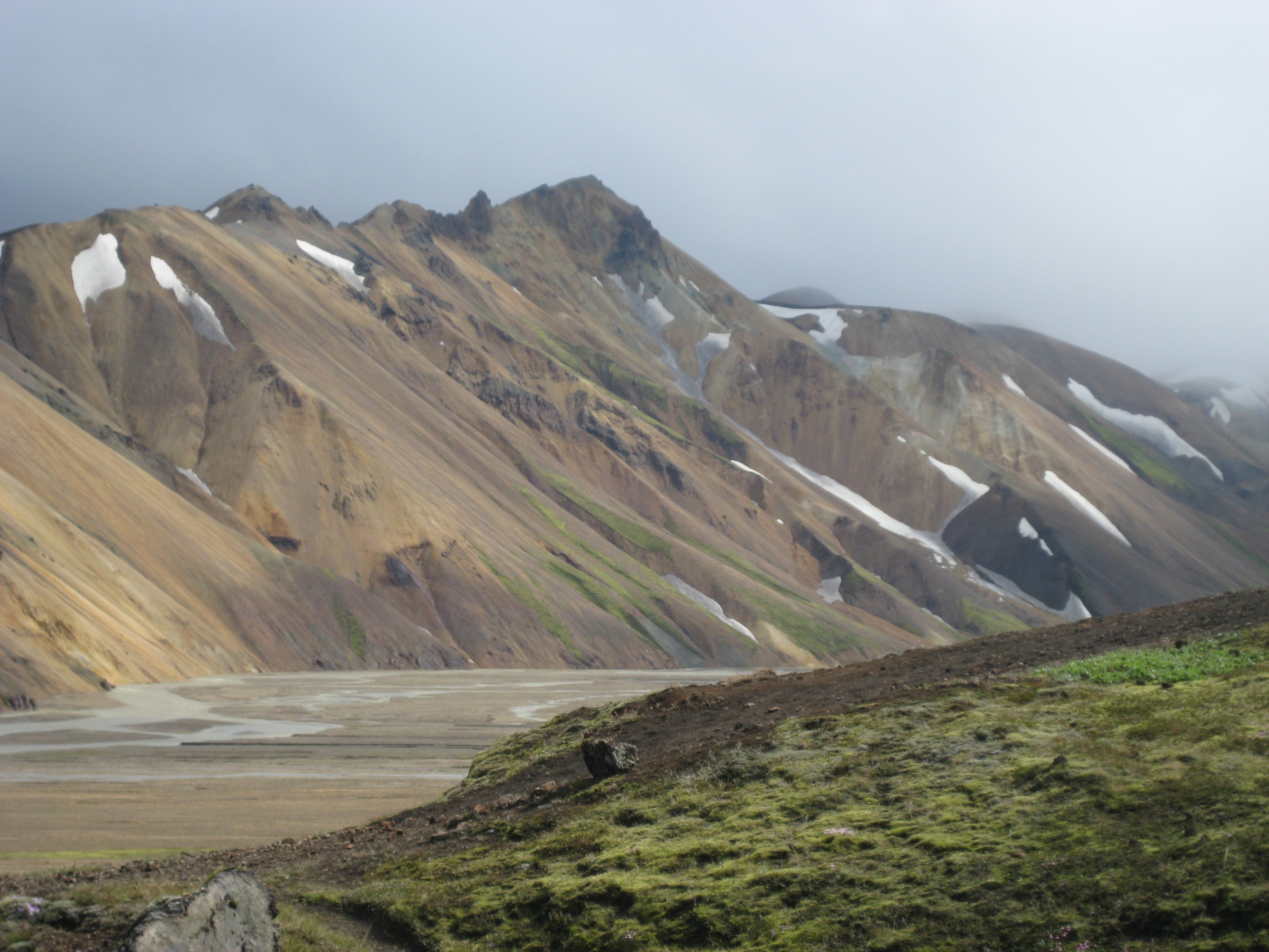 After a quick lunch at the huts in Landmannalaugar, we set off uphill as the sun breaks through the dark clouds lingering in the aftermath the morning’s heavy rain. I have never seen anything like this strange volcanic landscape, with its mixture of obsidian boulders, barren sands, green alpine fields, and not a single tree. Climbing higher, we cross a narrow ridge with wide-open views of endless rolling pasture backed by folds upon folds of mountain peaks. We walk across mushy snowfields that usually have melted by this time of year – the first part of July – but which remain intact because of the cooler weather Iceland has experienced this spring and summer.