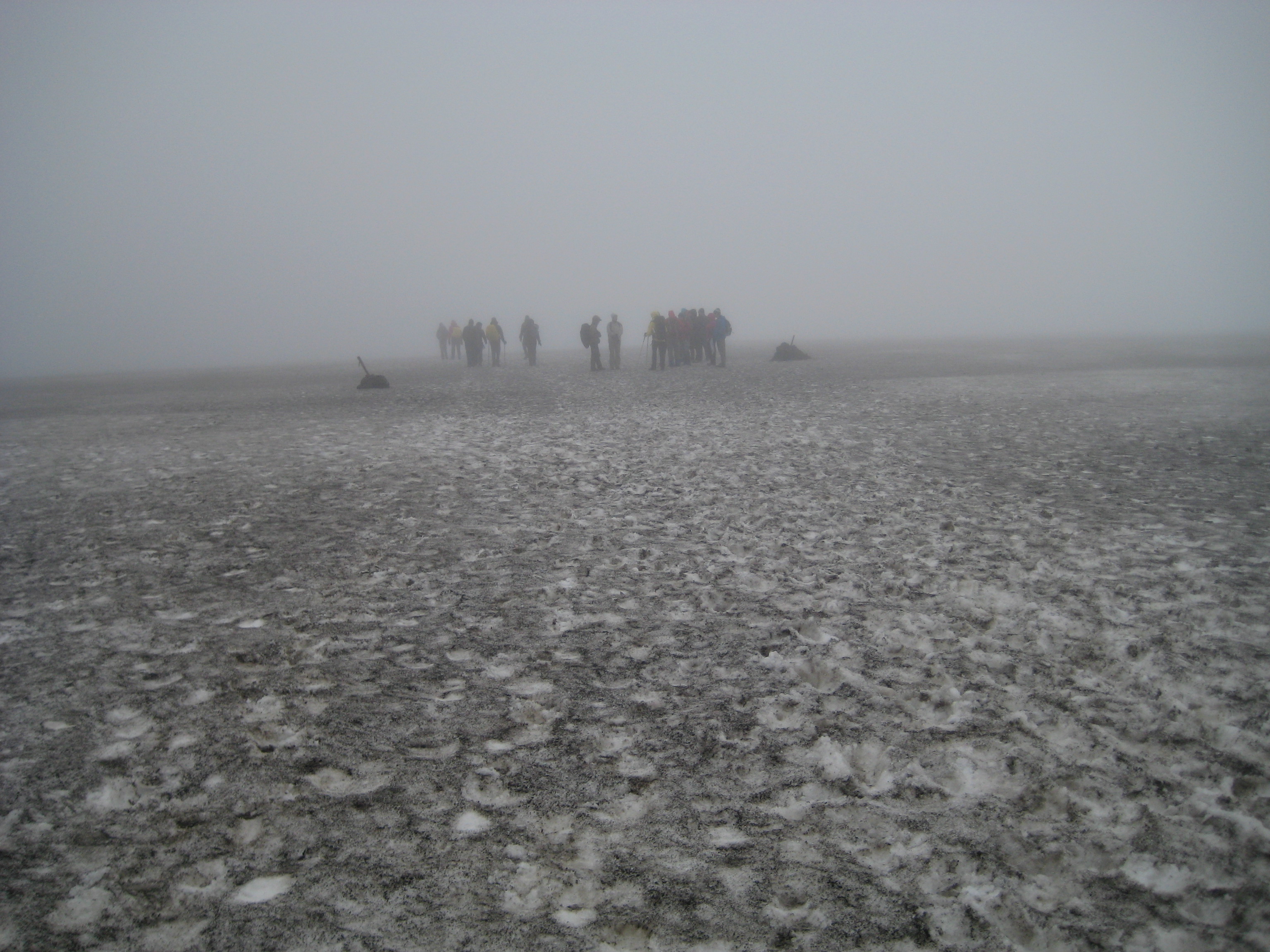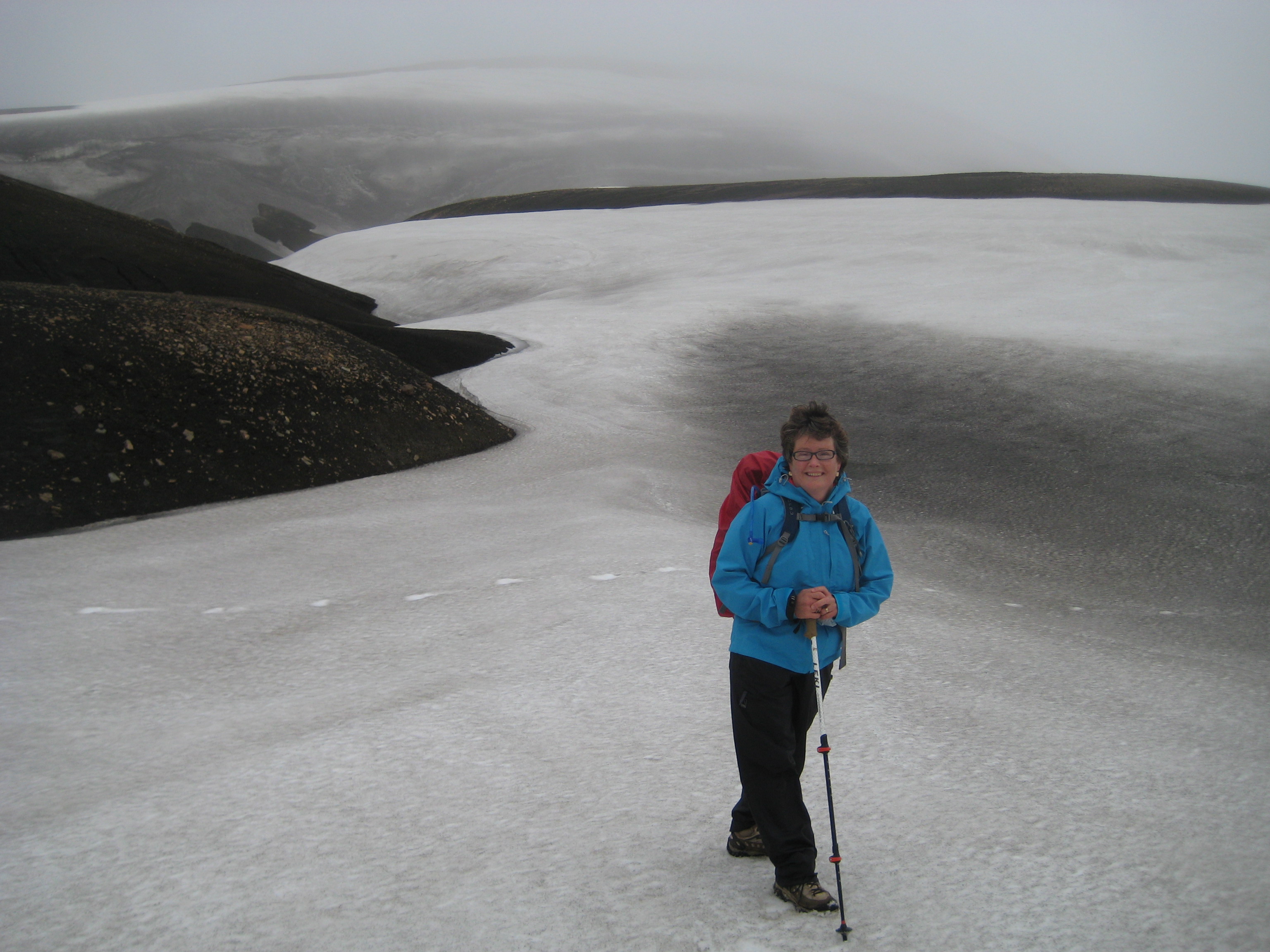 In the late afternoon, we hike through a cloud of mist that decreases visibility to about 50 feet. Although the scenery is winter-like, the temperature is comfortable. Finally, around 6 o’clock, we arrive at our first hut, Hrafntinnusker, where our guide Elin prepares a late dinner of mild fish – what she calls catfish — with a white sauce and rice.