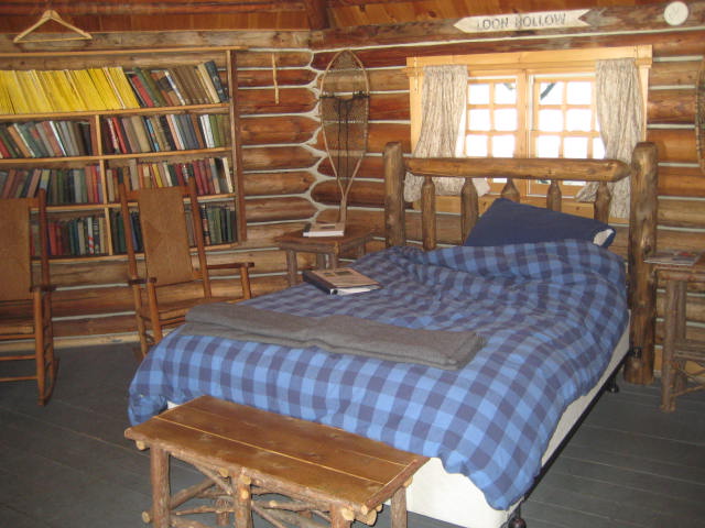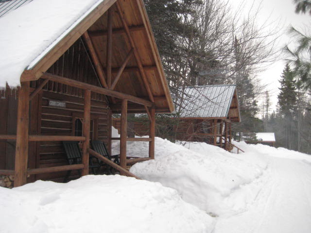 Instead of the buzz of the snowmobiles that flock to these parts come winter, I hear my boots crunching on snow as I walk up the short hill to Gorman Chairback Lodge, to pour myself a cup of coffee. The cook is working on breakfast, but the comfortable couches around the wood stove are empty, everyone still snuggled in their beds in the cabins sprinkled on the property. The leather couches are inviting, but I take my coffee to go, for the cozy experience of reading in bed in the Library.
