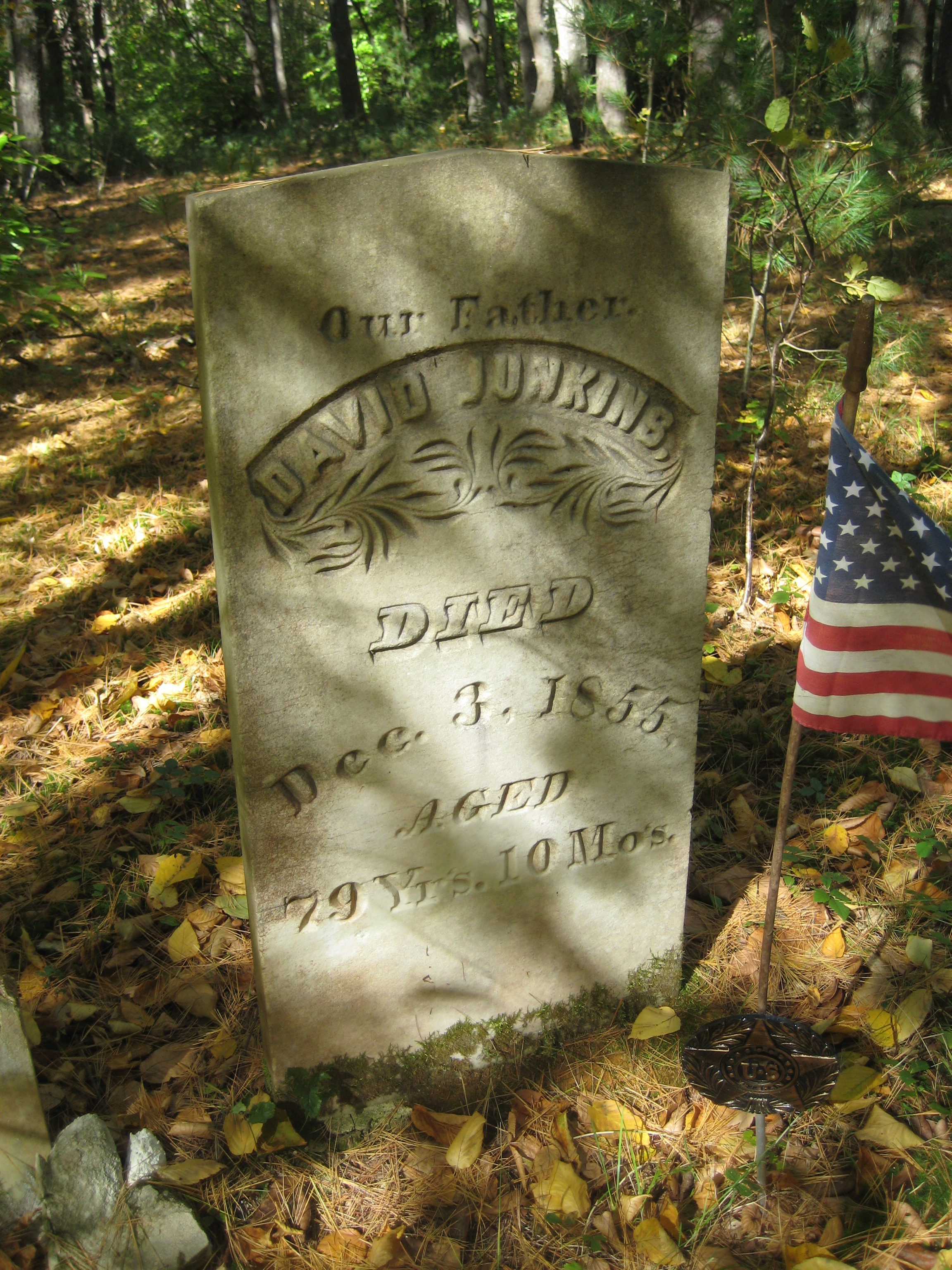 Jeremy and his friend soon located the oldest grave is the first cemetery, a small well-maintained patch of land surrounded by a wrought-iron fence. Then they dashed off down the Barred Owl trail, where we found the second Jenkins cemetery up on a little knoll. One small stone marked the grave of a small child. “What do these initials mean?” Jeremy asked as he pointed towards an even smaller stone. I explained that the stone was probably the footstone for the headstone, which memorialized a baby’s short life.