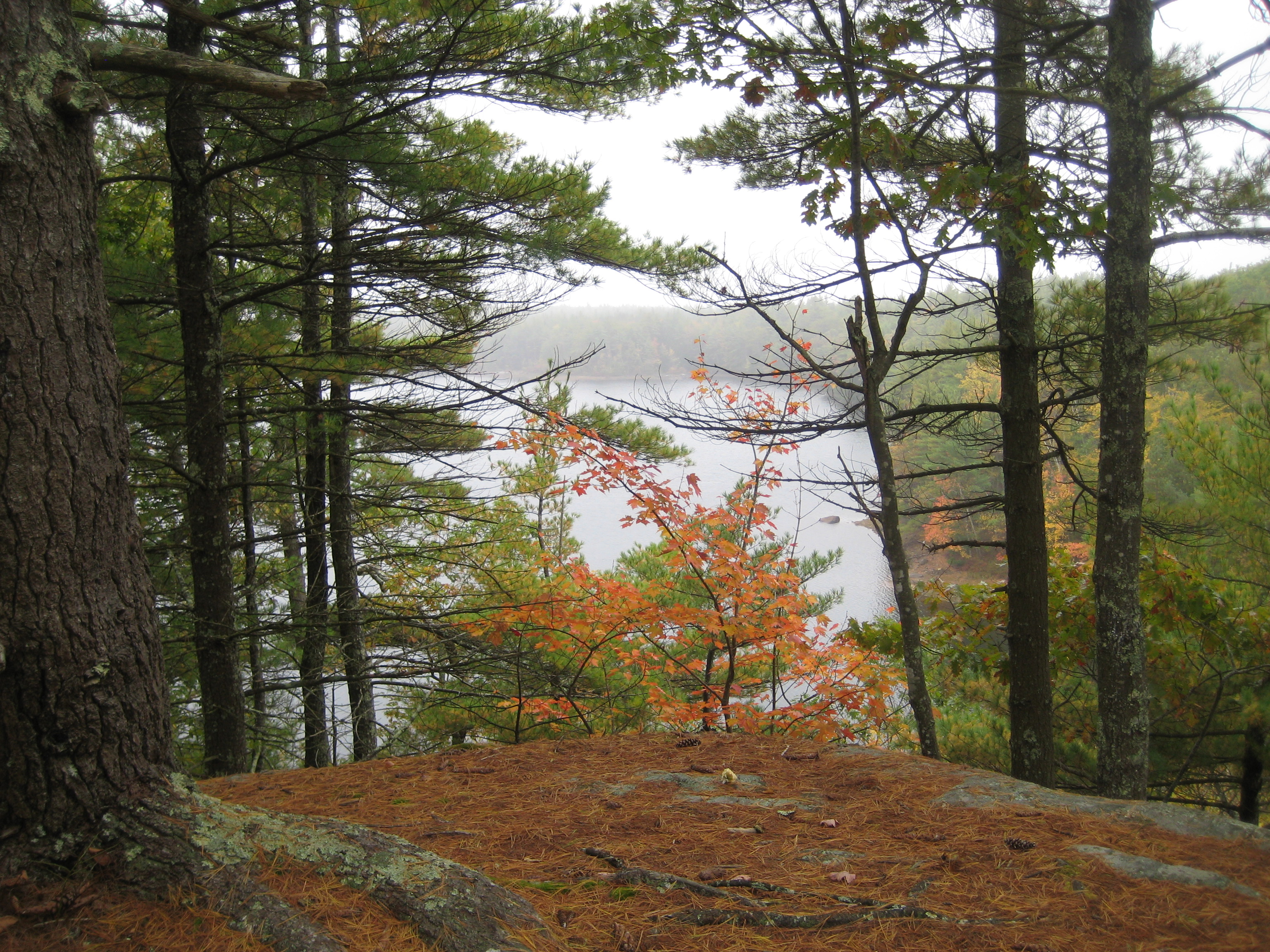 When the White Trail intersected with the “Yellow Trail”, we took the turn (on “yellow”) towards Mount A, 2.4 miles away. A few minutes later, I recognized the side trail up to the rise that overlooks Folly Pond. We climbed uphill, then settled on some smooth stones carpeted with pine needles to enjoy a picnic lunch and the view of the pond through the pine trees. Steep cliffs drop down to the pond, but the boys were busy on another rock, discussing Minecraft, so I enjoyed my lunch without the hovering possibility of a boy falling overboard.