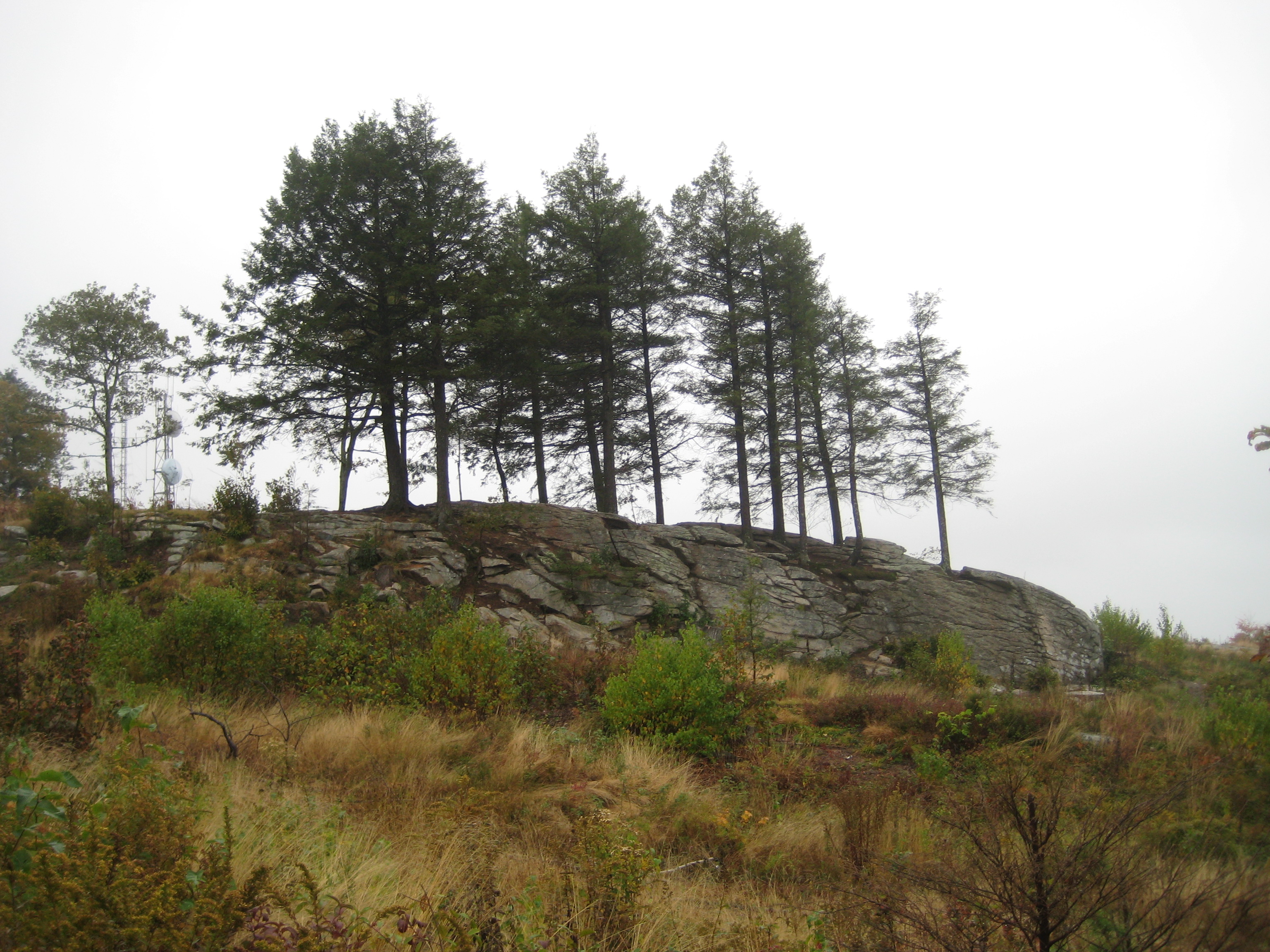 Mount Agamenticus offers many routes to its summit (the most direct being the road). The most direct route, from the parking area at the base of the access road, is the Ring Trail to the Witch Hazel Trail. After 20 minutes of steady uphill hiking, we again emerged from the woods, to a view of a granite cliff topped with a row of pines. Nearby, the viewing platform offers a view of Mount Washington, but not on this day, as the clouds had rolled in.