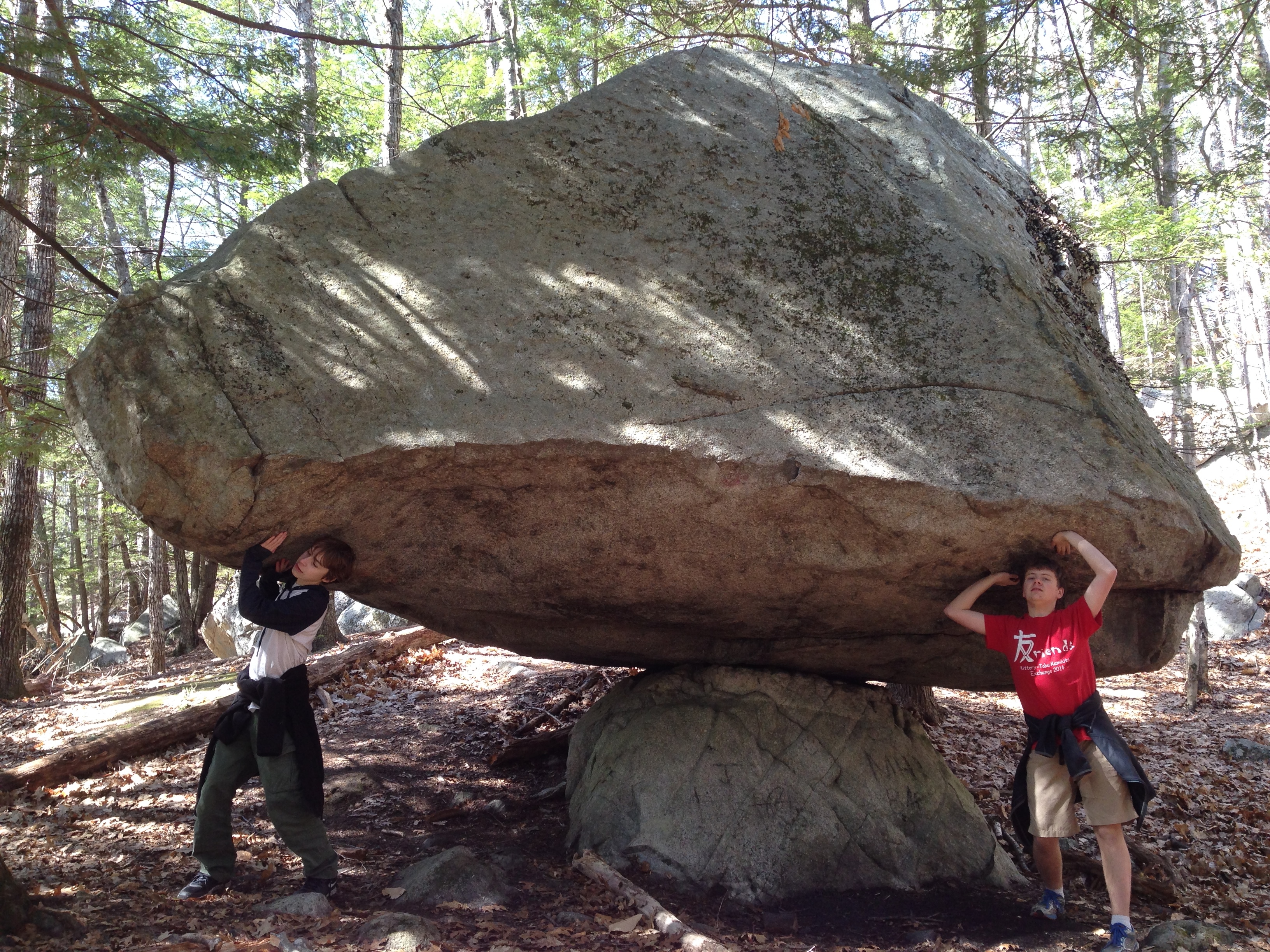 Continuing on the main trail, we ascended Spring Hill and discovered the Tatnic Ledges, with a pre-foliage view of Mount Agamenticus. We were beginning to wonder if we had missed the turn-off to Balancing Rock when we came upon a small sign pointing the way.