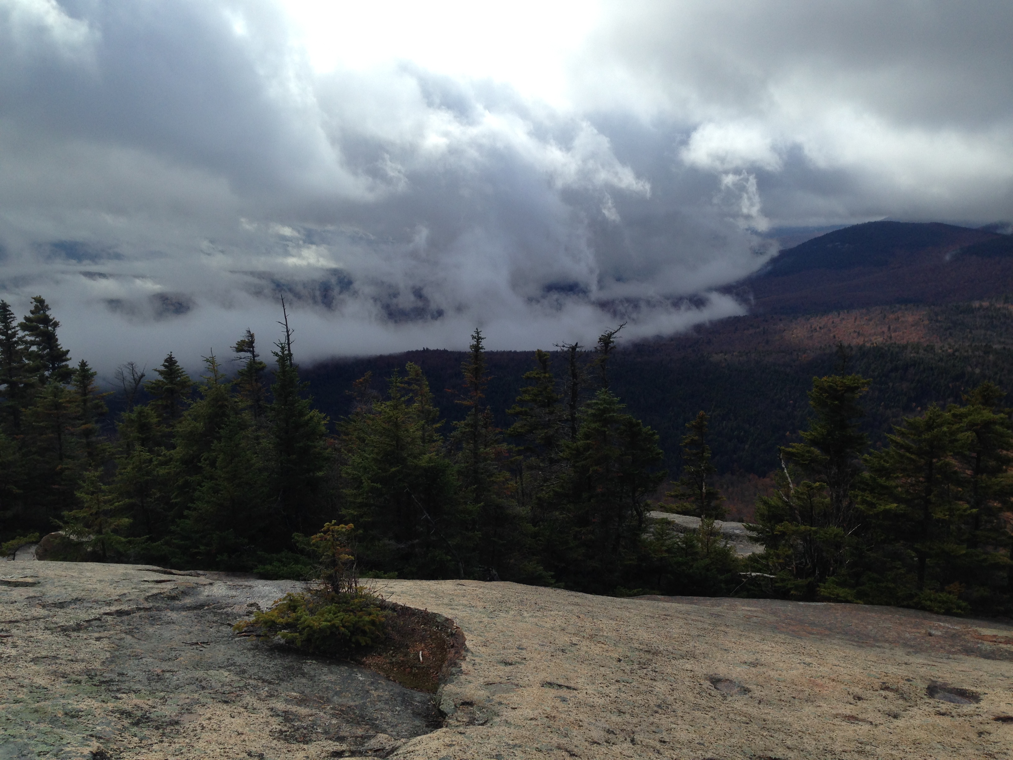 The summit of Mount Paugus is buried in trees and we didn’t attempt a bushwhack. Instead, we hiked on the Lawrence Trail until it crosses an open but tree-shrouded patch of ledge. There, with a small detour, we found west-facing views.