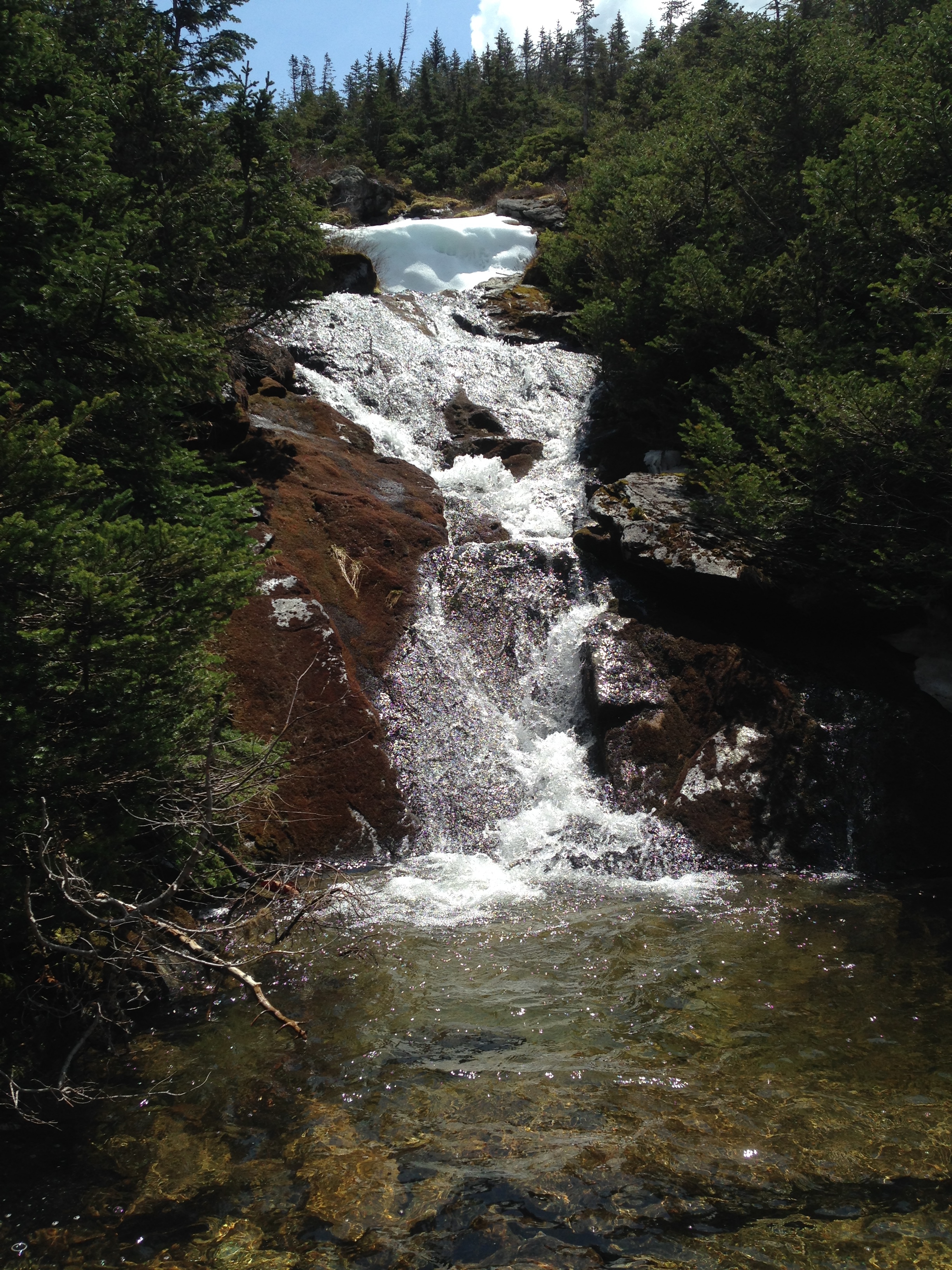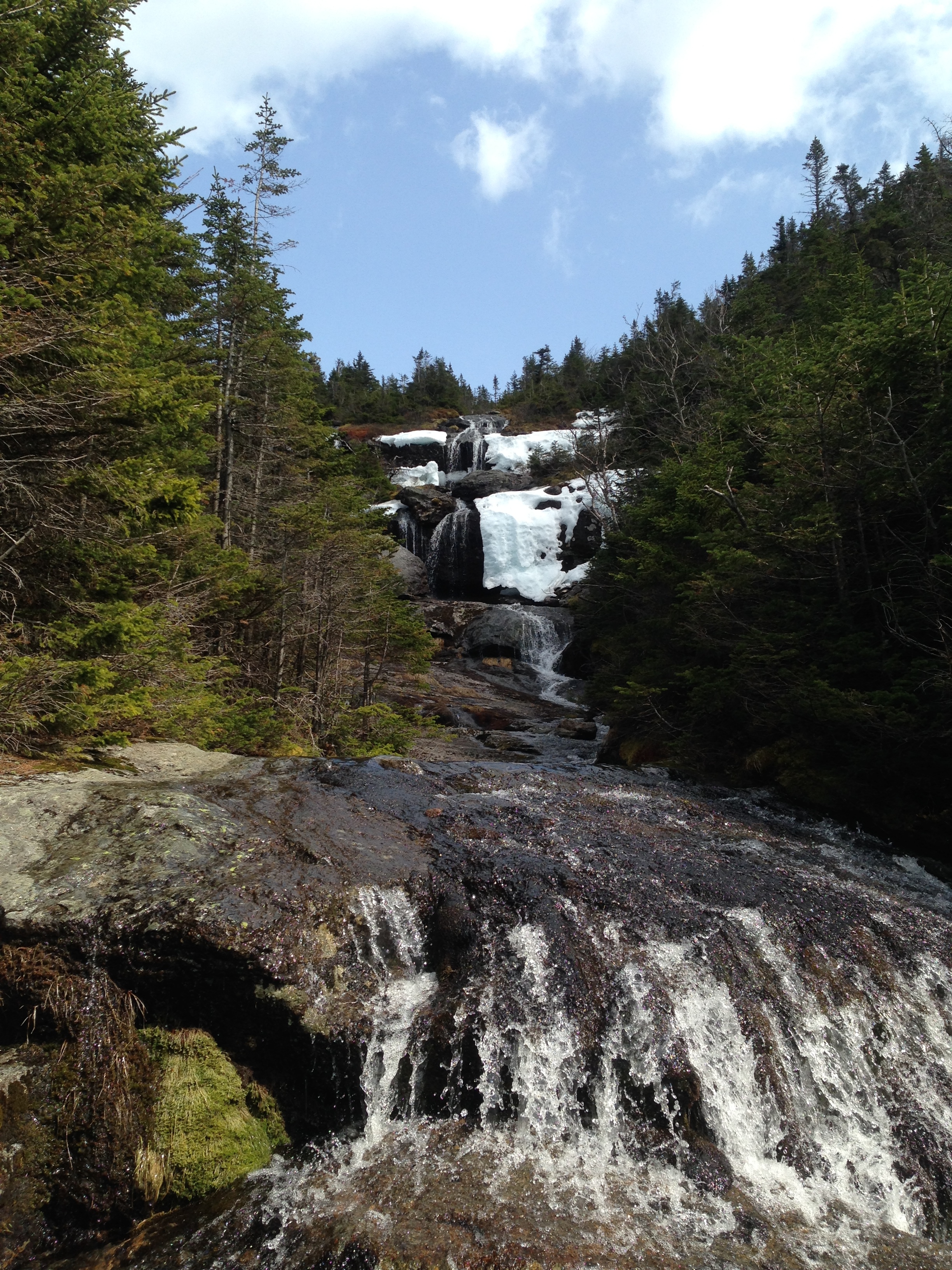 Even with the steeps, I couldn’t stop smiling, as I discovered waterfall after waterfall. I’ve never seen so many beautiful waterfalls on one trail, except in Iceland. As I approached the upper half of that mile, I began to encounter patches of hard-packed icy snow. The sun had softened up the snow, and on flat spots, it was easy to walk across.