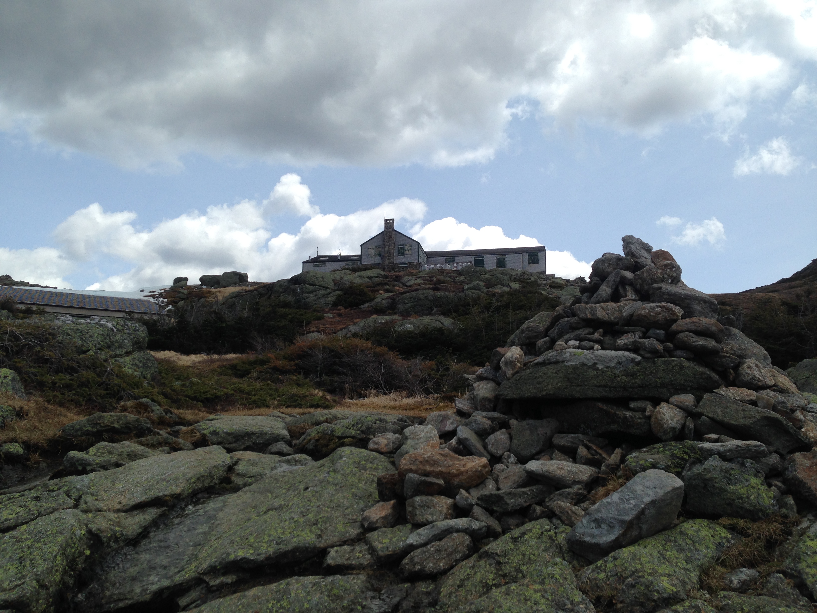 On Mount Monroe, I enjoyed a quick lunch as the wind picked up and gray clouds hovered above Mount Washington. Although the forecast did not predict any storms, I know that in the Presidentials, the weather can change quickly. I made my way down to Lakes, and rested a bit on a sunny bench there, out of the wind. It was lovely to sit by the always-busy hut with no people except a small AMC research crew out collecting data on flower blooms.