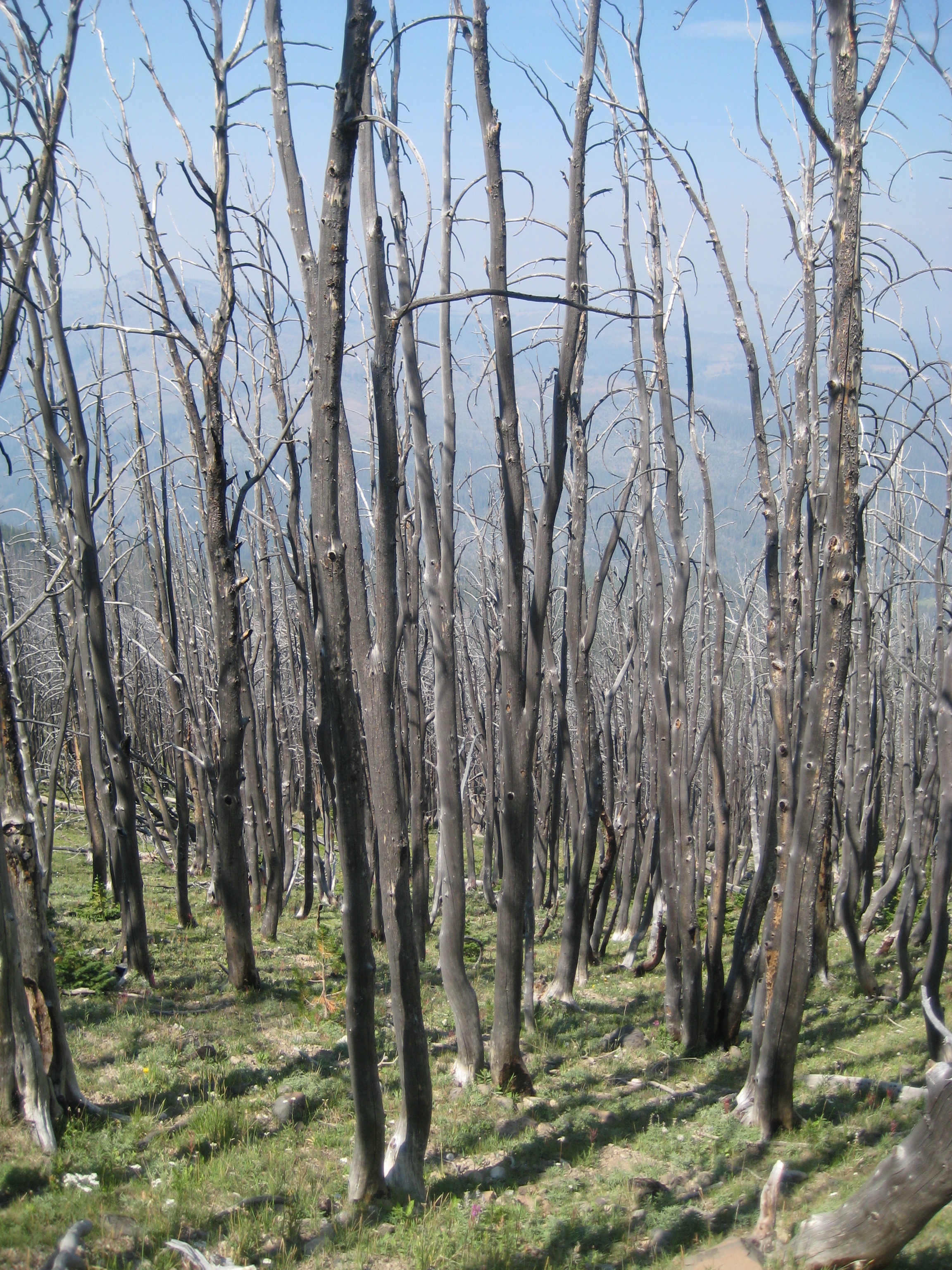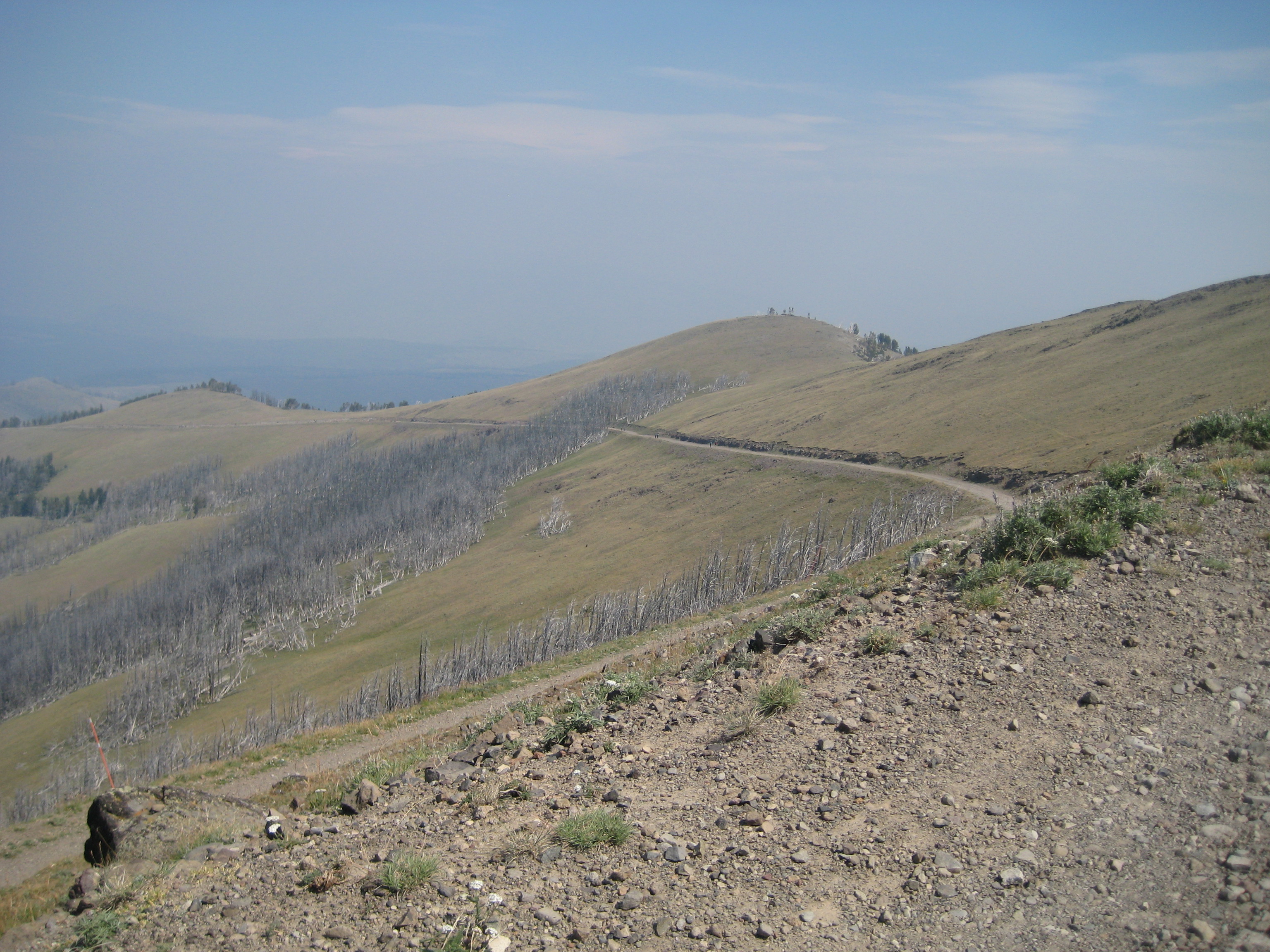 From my 1984 visit, I remember the clarity of the alpine air and a scene much like that described by Doane. On this August hike, the view was hazy, obscured by the persistent smoke of several small forest fires. Throughout the day, a faint scent of smoke pervaded the air. On the trail, large swaths of gray lodgepole pines swept up the mountain’s flank, gray ghosts left from the forest fires that consumed much of Yellowstone in 1988. The hazy views are partly the result of new fire management policies implemented after the devastating 1988 fires, which were exacerbated by the then-existing policy of extinguishing fires as quickly as possible. Although well-intentioned – who wants to see a forest consumed by fire? – the “no-burn” policy caused dead trees to gather on the forest floor, creating ideal “ladders” for fired to climb into the treetop crowns, and then quickly spread throughout the park.