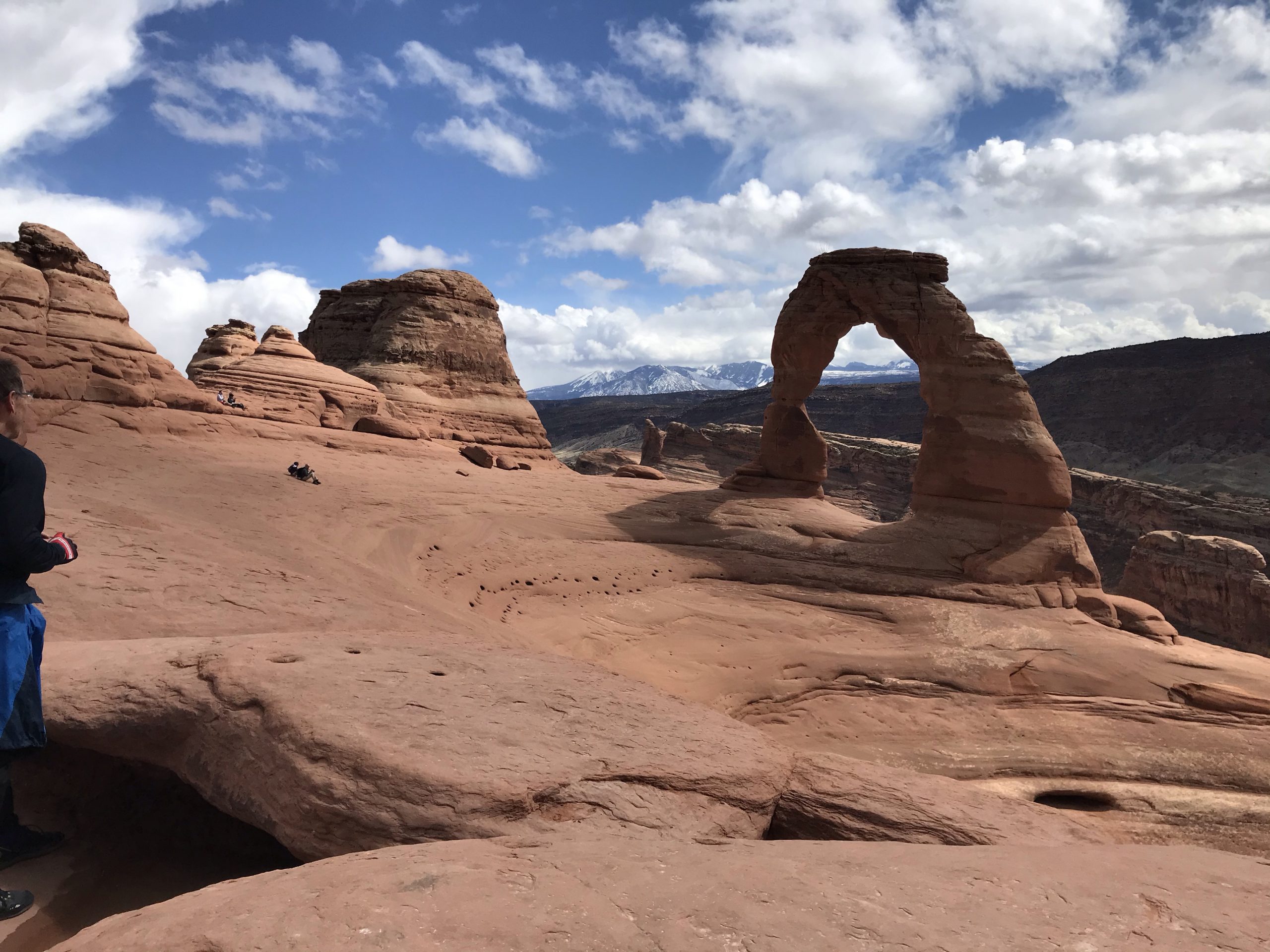 The hike to Delicate Arch took us up along open sandstone slabs, easy on legs used to the steep trails of eastern mountains (but probably hot as hell on a summer day). In the distance, thunder rumbled, and we kept a close eye on a dark cloud to see where it was heading.