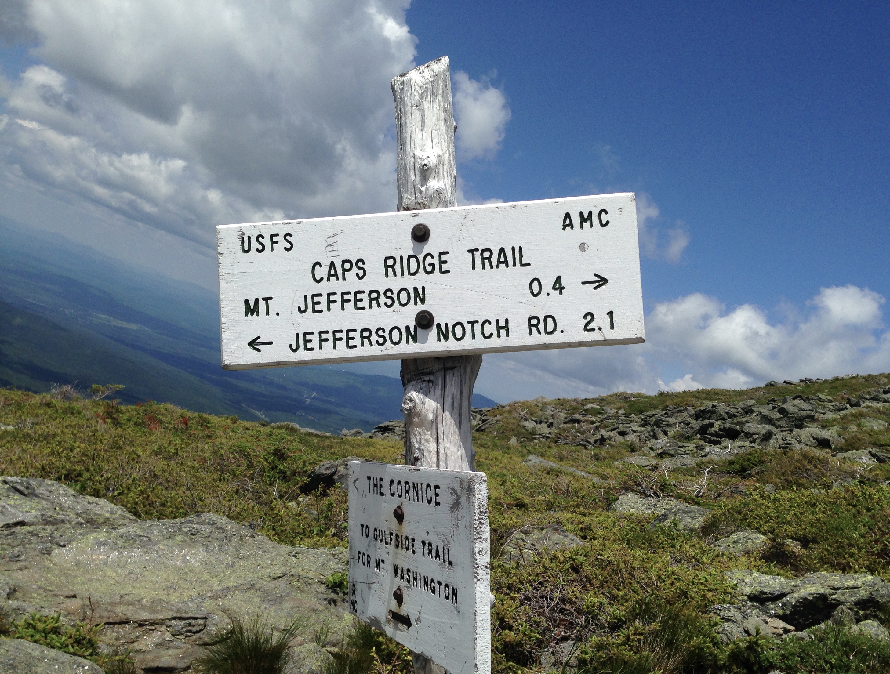 The Caps Ridge Trail begins at the height of the land on Jefferson Notch Road, the highest road in New Hampshire (closed in winter). The turn to the Notch Road is 3.5 miles down the Cog Railway Road, off Route 302 and near Bretton Woods Ski Resort.