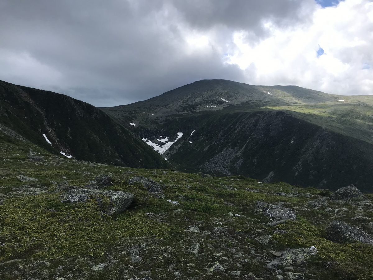 After our rest stop, we continued upward as an ominous gray cloud rolled in over Mount Washington. By now, the wind had subsided — probably a front had blown through and brought the cloud — and the air had chilled, but the temperature remained comfortable. Still, we weren’t sure whether the cloud would just sit there hanging out or evolve into a thunderstorm. We reached the junction with the Davis Path around 2 p.m. and contemplated our options.