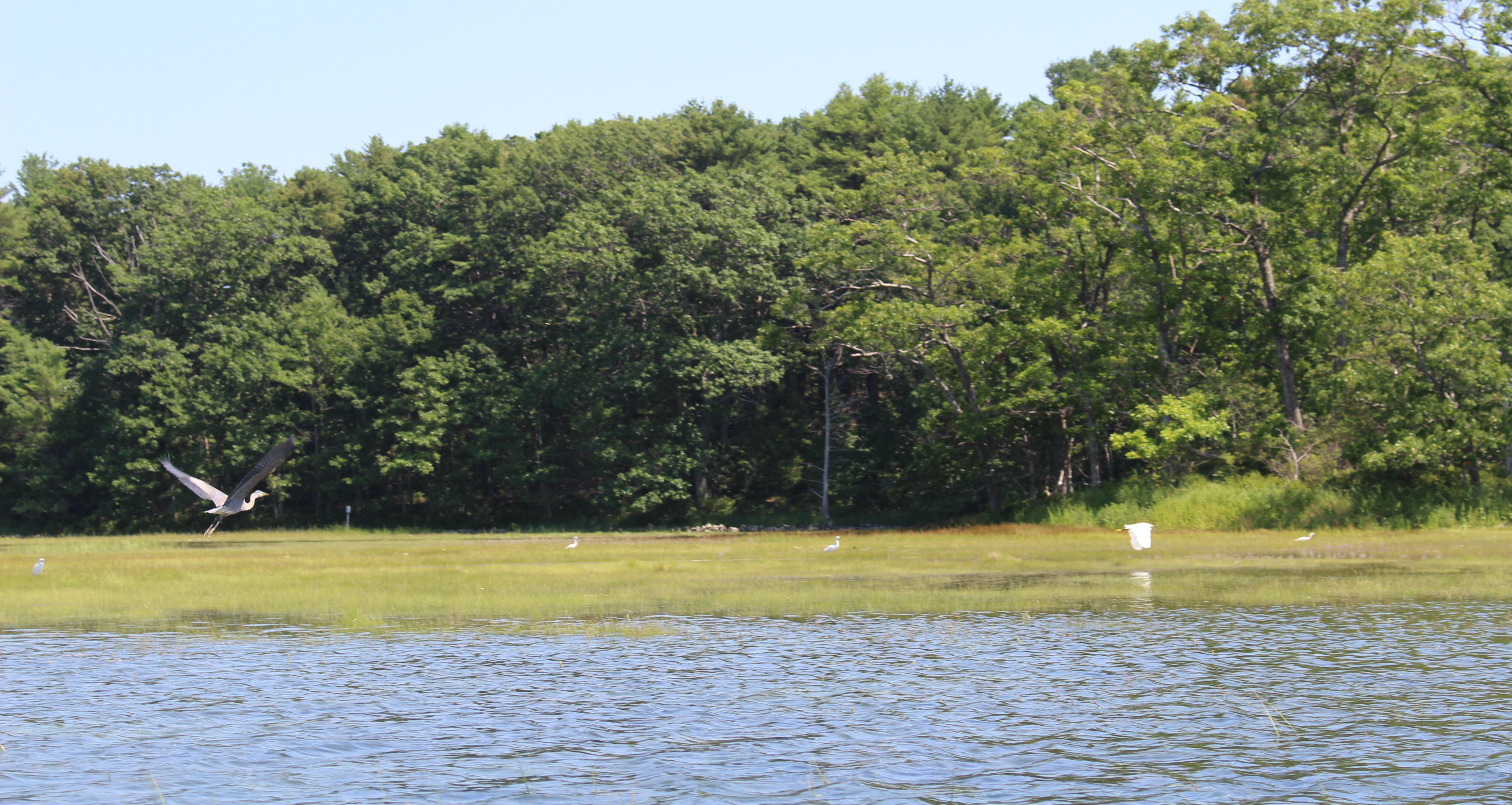The marsh is close to home, but feels remote and wild. I spot a kingfisher, skimming across the grass and up into the trees. A family of snowy egrets wades on the flooded plain. In the distance, the surf thuds at the harbor’s entrance.