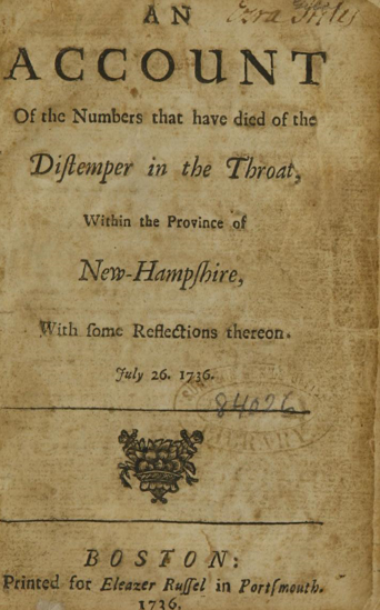 Fitch, Jabez, An account of the numbers that have died of the distemper in the throat, within the province of New-Hampshire : with some reflections thereon ; July 26. 1736. U.S. National Library of Medicine.